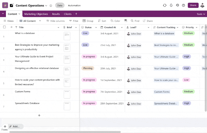 It combines the familiarity of spreadsheets with the structure of a database, along with built-in automation, integrations, and AI capabilities. The focus is on managing workflows, not just displaying them.