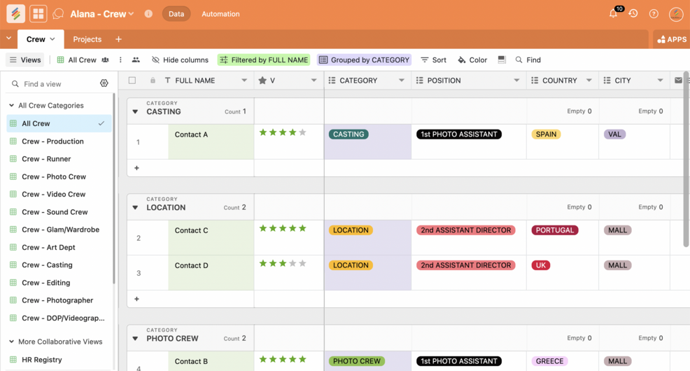 Stackby offered a single platform where Alana could organize every aspect of their production process, including cast and crew databases, client details, and equipment inventory.