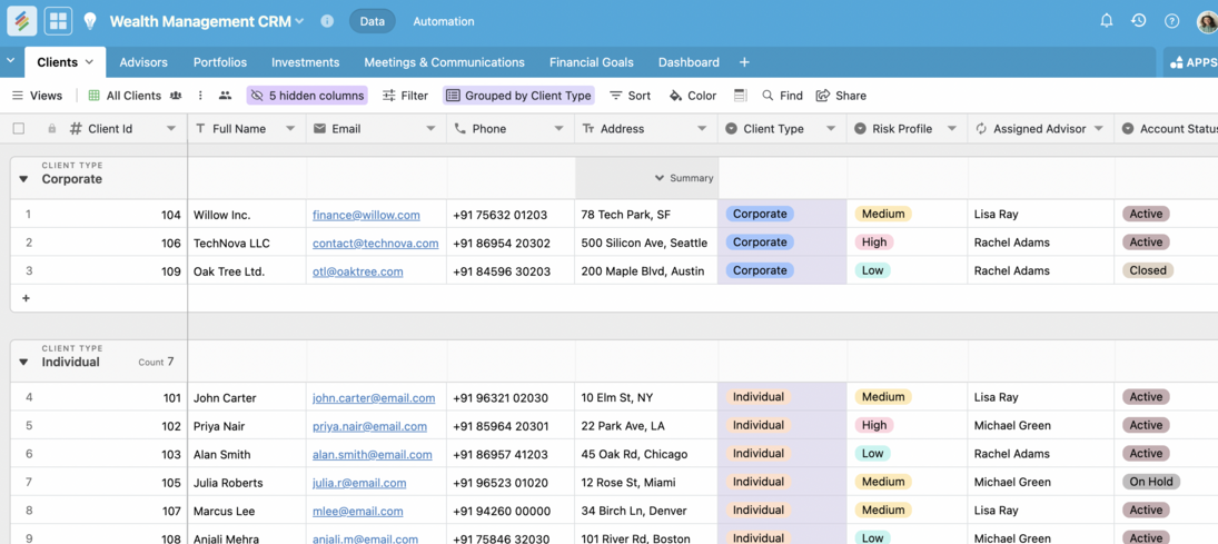 As a growing wealth management firm, we needed a CRM that could adapt to our unique client onboarding, portfolio tracking, and compliance workflows. Off-the-shelf solutions were too rigid or too expensive. Stackby allowed us to build our own CRM — fully customized to our advisory process. We now manage 5,000+ client relationships, track client orders & investments, and automate follow-ups — all in one place. It’s secure, flexible, and fits how we actually work.
