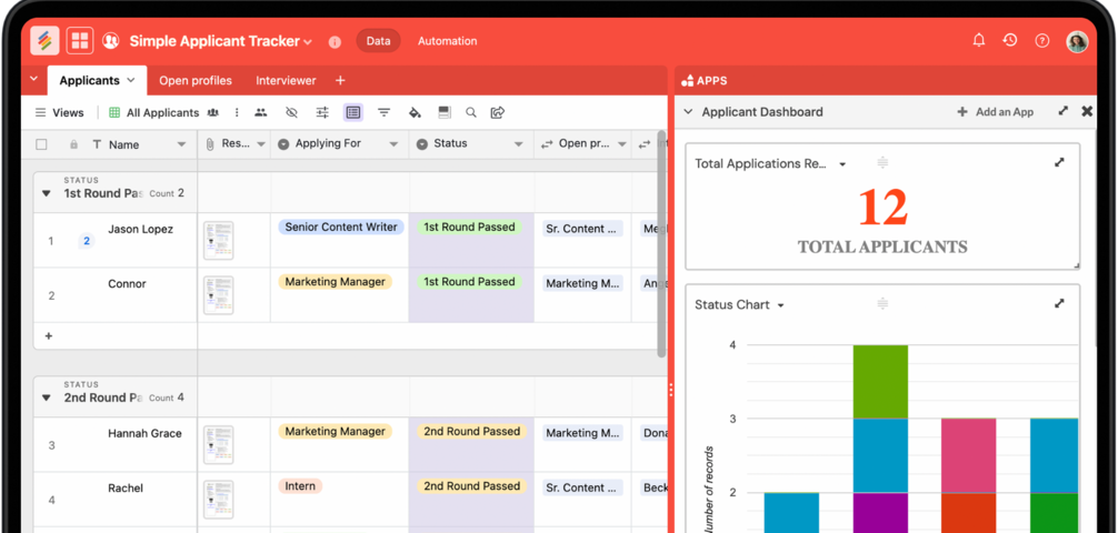 Stackby is great for building custom applicant trackers to automating your recruitment pipeline, tracking your hiring and onboarding checklists, consolidating all your HR assets & knowledge bases in a single place. You can also automate leave requests, employee feedback, employee training and events - and bring all the workflows in one place.