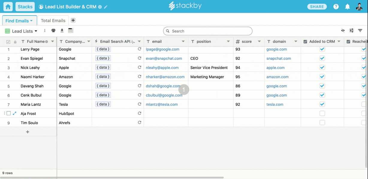 Build your lead lists, verify emails and add it to your CRM with Hunter.io API integration with Stackby.