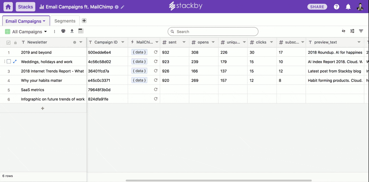 • Bring in detail about email campaigns or audiences directly into Stackby