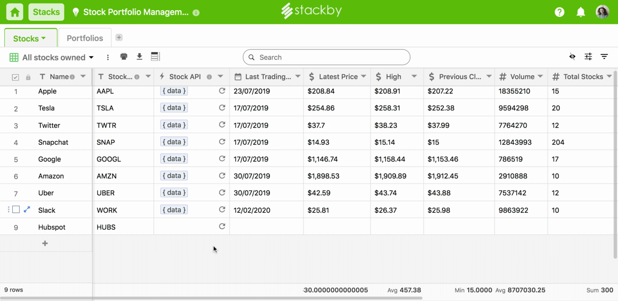 Stackby helps you pull AlphaVantage Stock API information right inside your tables.