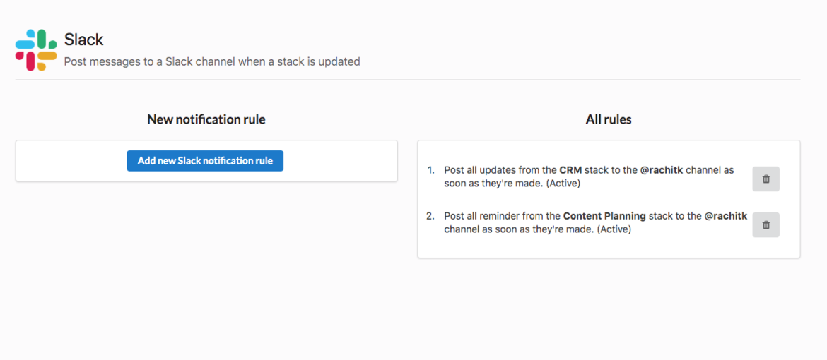 Your notifications on Slack via Stackby is dependent on the selections you have made per rule for a particular stack. One thing to keep in mind is that the Slack integration works at the row level and not at the column level. So the notifications and reminder messages will be coming forth only at row level.