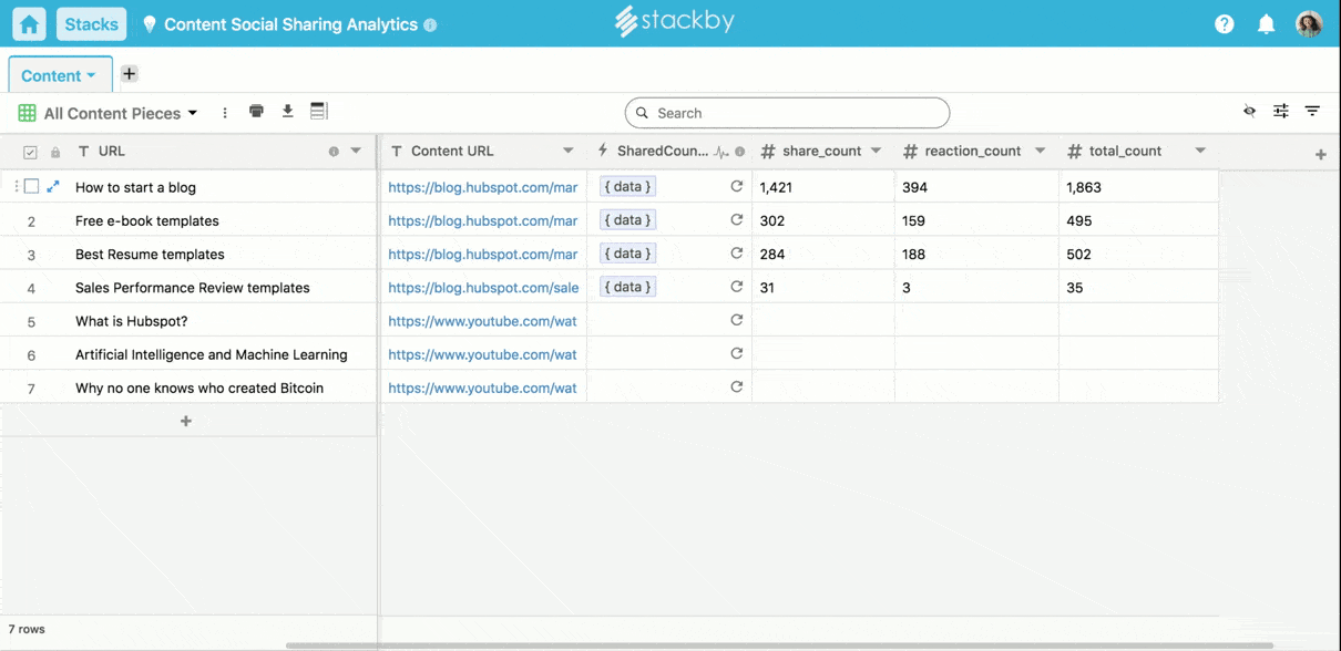 Using the direct integration Stackby has with SharedCount you can directly bring the share count data into Stackby and analyse and work accordingly.