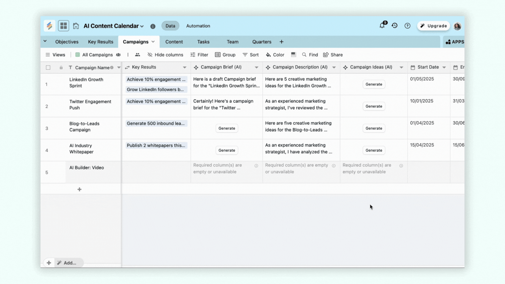 We've launched AI field agents that allow you to generate content (briefs, captions, descriptions etc.), summarize text, analyze documents and images and even translate campaigns at scale. Whether you're managing your AI content calendars, to building an automated brand checker to even generating AI social media posts - the possibilities with AI + marketing workflows is endless. Integrate with OpenAI, Anthropic or Gemini, bring your own API keys and let the AI magic transform your marketing workflows.