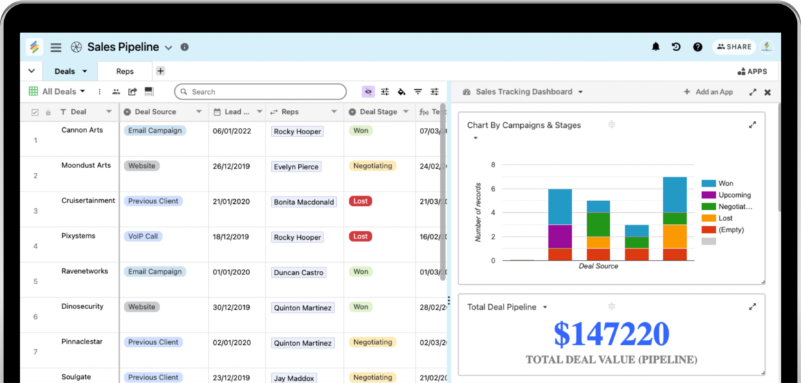 Use Stackby's out the box apps to create your custom reporting dashboard. Analyze and bring real-time insights with custom charts, pivot table, summary bars and more.
