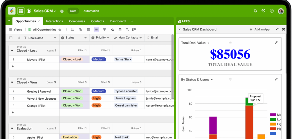 Absolutely. With 30+ unique field types, 8 visualization options, advanced form builder, reporting dashboards, internal automations, and custom activities on records, Stackby gives you everything you need to run a complete Sales CRM. You also get two-way email sync with Gmail and Outlook, so all conversations stay linked to your records.