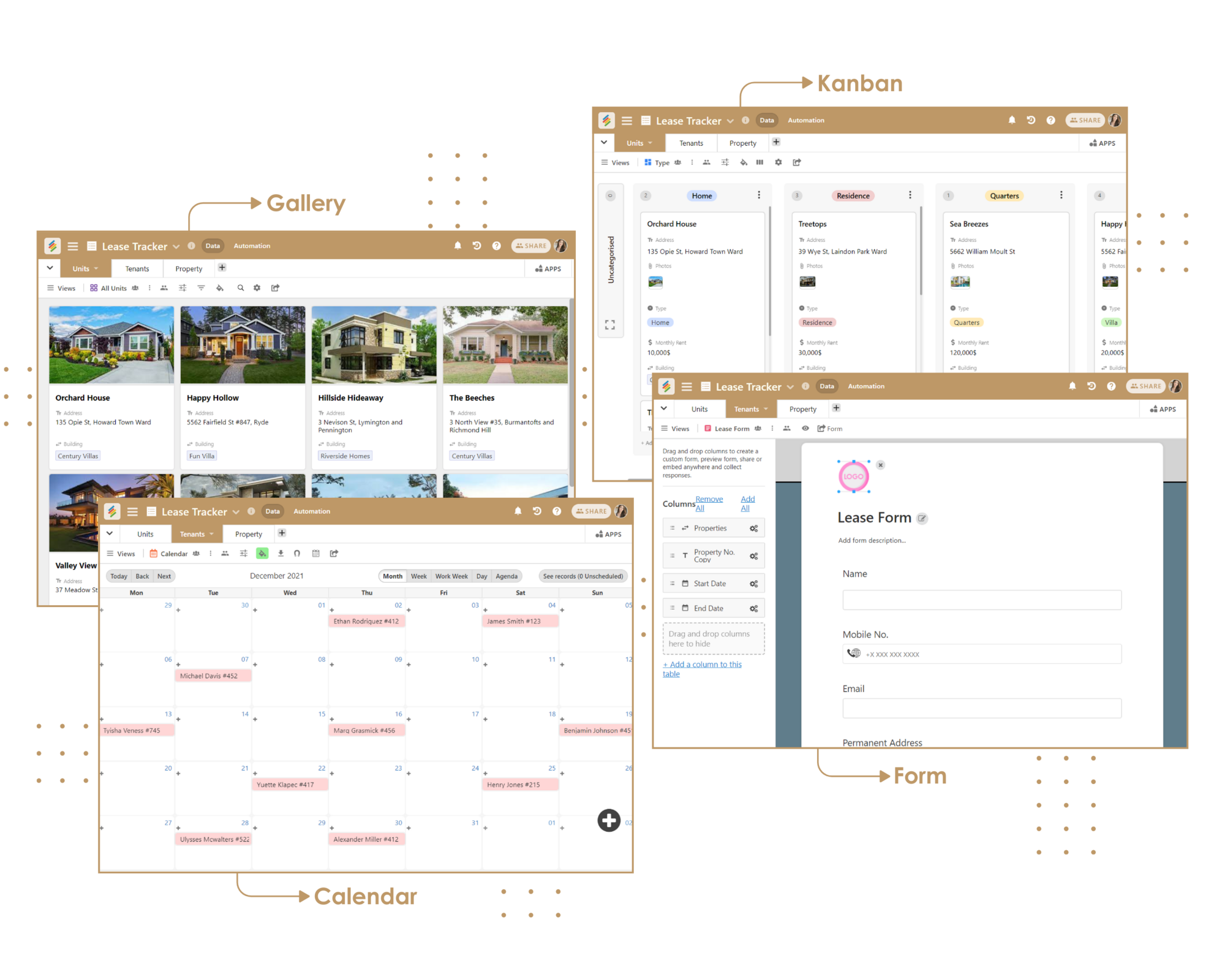 From residential sales to lease management to commercial acquisitions, manage all your data in a single place and visualize in Kanban and Gallery or stay on track with Calendar and collect information via Custom Forms.